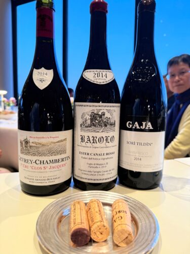 記得七年前我與 Annalisa 和 Elvio 在這裏晚飯時,比試了 2011 的 Gaja 與 Armand Rousseau,今天多了四位,除了 Gaja 與 Rousseau,我加了一支 Giovanni Rosso 的 Vigna Rionda,三支都是 2014 年的。
