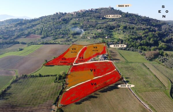 海拔從 520-540 米的 La Pullera 我在七年前的遊記介紹過了(見:2018 意遊雜記之一:Le Chiuse 的桂冠),當時 1.5 公頃大,這幾年 Lorenzo 又加種了 1 公頃,如今共 2.5 公頃。2017 年正好滿五年可以釀 Rosso,2022 年應該是第一個 Brunello 年份。