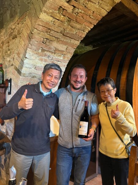 我們先試 2024 Rosso,才 12.5% 酒精,感覺冷冽,原來那是比較冷的年份。Lorenzo 說 2023 與 2024 同是 Montalcino 重要的範例。果真力量與優雅兼備,酒精度低,入口圓潤,很讓人期待。