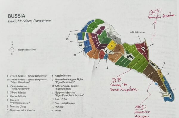 - (最頂端) Famiglia Anselma:這家酒莊有點隱世,似乎有一段歷史。我收藏了一瓶他們的 1971,我寫信問酒莊他們始於何時,Marta Anselma 囘我說這瓶酒肯定屬於她的家族,他們已經產酒多年了,但她沒有多説。新的一代從 2010 年代重新有酒出售,Pianpolvere 的第一個年份是 2013 年,約有 1.02 公頃。他們另有一款叫 Bussia 的,據 Marta 說那其實是 Pianpolvere 向東的部分來的,面積 1.35 公頃。Bussia MGA 是我最早試的一款,很驚艷,因此我才開始狩獵他們的 Pianpolvere,我買到 5 個年份。
